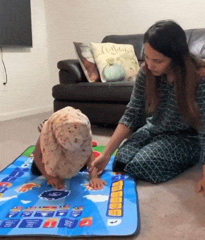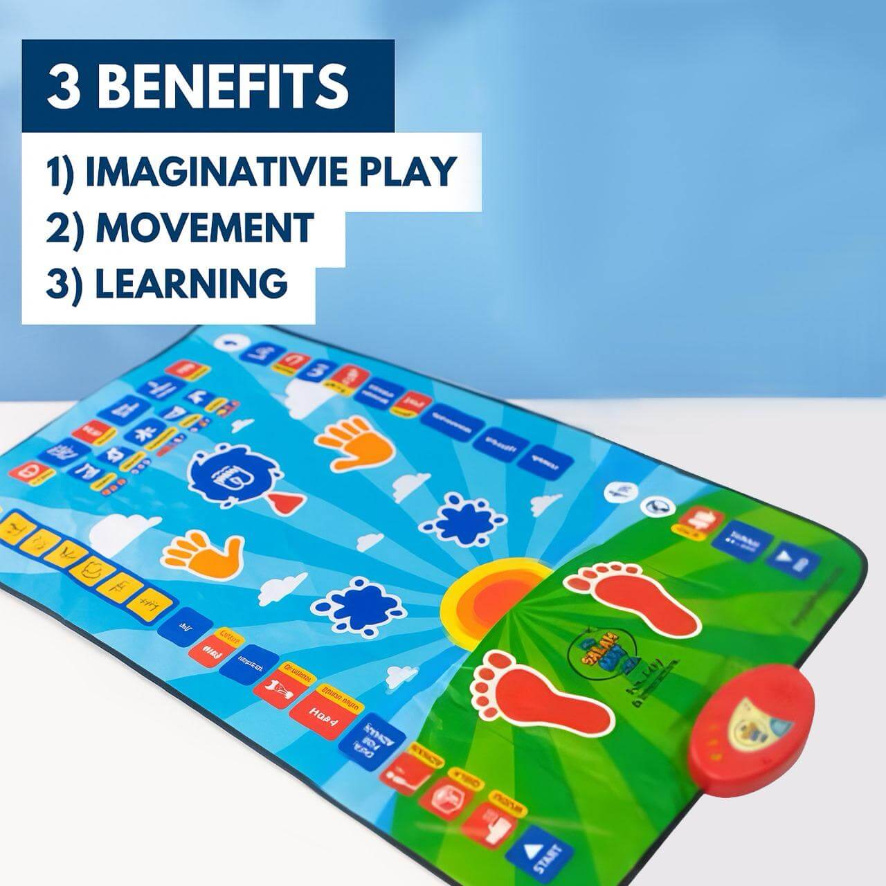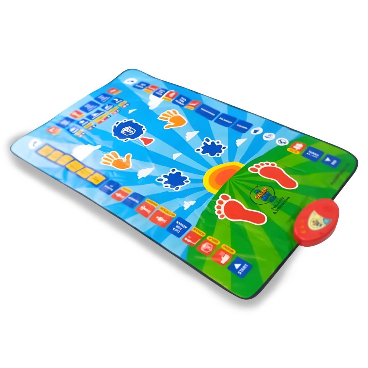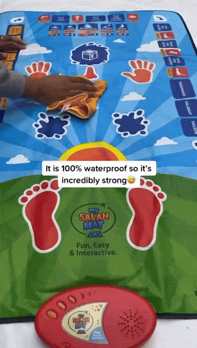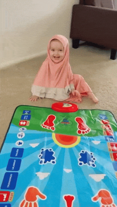 It’s an interactive mat with sound and visuals designed to teach kids Salah step by step in a fun way.